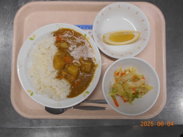 【献立】 牛乳 チキンカレーライス こんにゃくサラダ くだもの(河内晩柑)