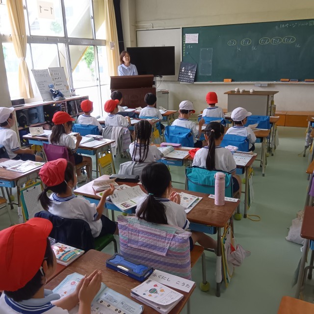 1年生は、音楽の授業で歌いながら手拍子をしたり、グループの友達と一緒に体を動かしたりしながら楽しそうに学習しています。子どもたちは、リズムをよく捉えたり、強弱などの表現をしたりできています。