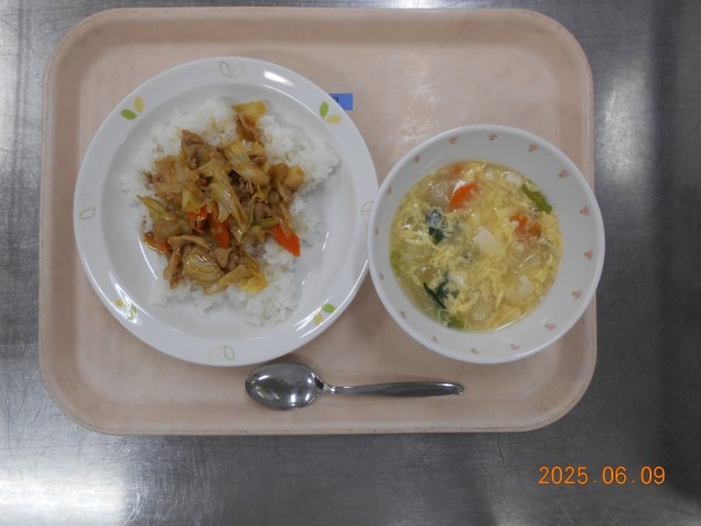 【献立】 牛乳 ホイコーロー丼 冬瓜とたまごのスープ