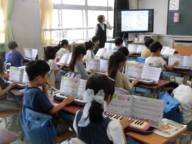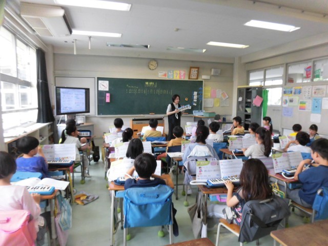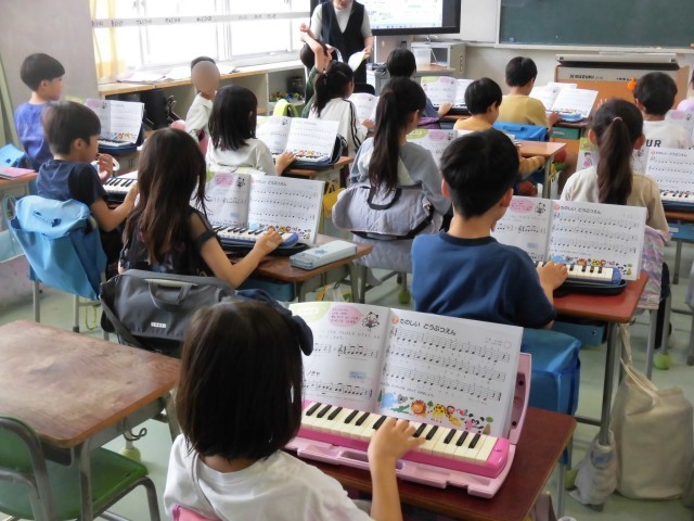 2年生の音楽では、鍵盤ハーモニカの練習をしています。同じ音が続く時は、舌の先で音を切ってふくタンギングを使って、鍵盤をおさえたままでふきます。「トゥ、トゥ、トゥ」と舌の先を上手につかってふけるように練習しました。繰り返し練習して、タンギングのコツもつかめたようです。同じ音がたくさん続く「たのしいどうぶつえん」の曲をタンギングで演奏しました。みんな上手に演奏することができました。