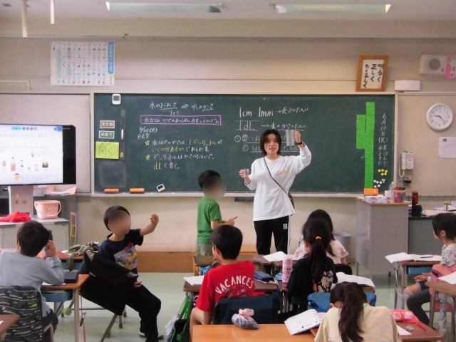 2年生の算数では「水のかさの単位」で、デシリットル(dL)、リットル(L)、ミリリットル(mL)の単位について学習します。デシリットルますやリットルますに水を入れて、それぞれ水のかさを比べました。「デシリットルって、コップの大きさに似てる!」など、実際に量ることで、それぞれの単位を理解して、量のイメージをつかむことができたようです。