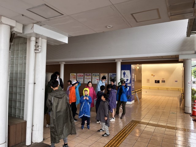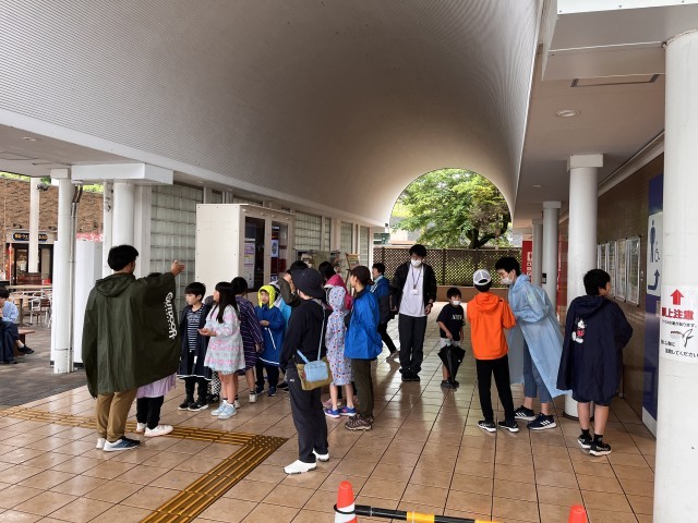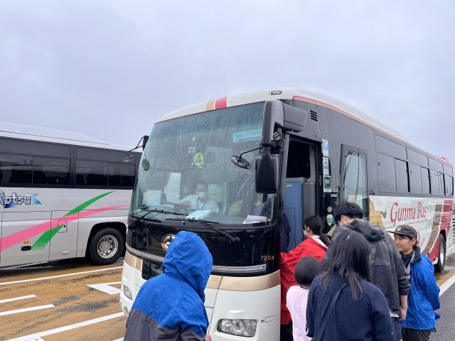 塚戸小の友達も同じバスに乗って、談合坂サービスエリアに着きました。雨が少し降っています。バスの中では、自己紹介をして、河口湖で楽しみなことを発表しました。「カレーライスが楽しみ」「ハイキング!」「恩賜林公園でみんなで遊ぶこと」「2日目の日直!」などたくさん出てきました。ワクワクします。