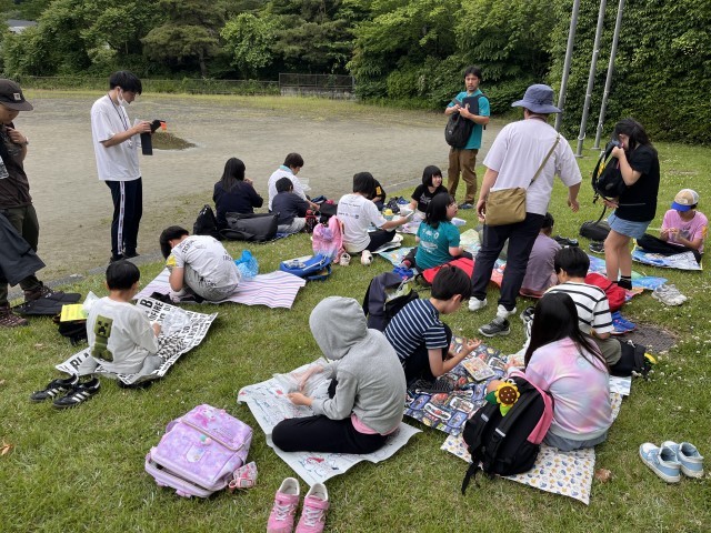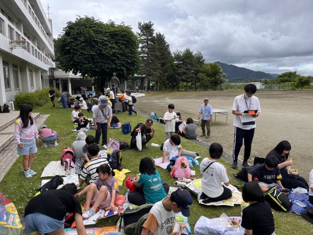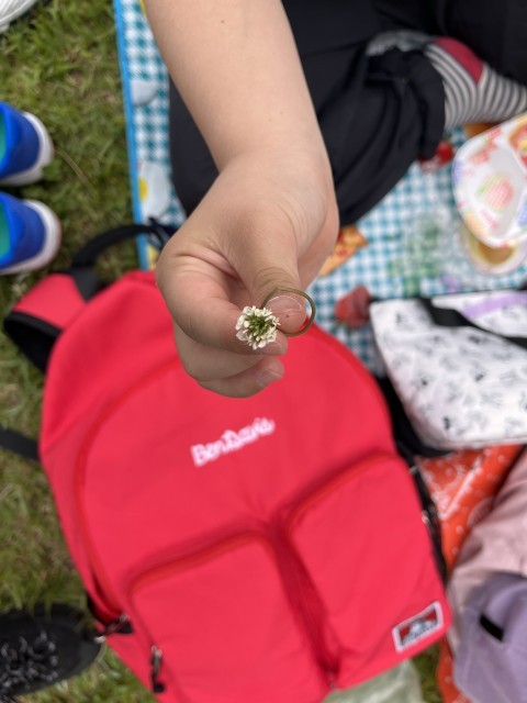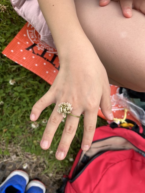 園庭でお弁当を食べました。おいしそうなお弁当ばかりです。ご準備くださりありがとうございます。早速、塚戸小の子たちとお友達になりました。明正小の子たちのすばらしい力です。シロツメクサで指輪を作りました。