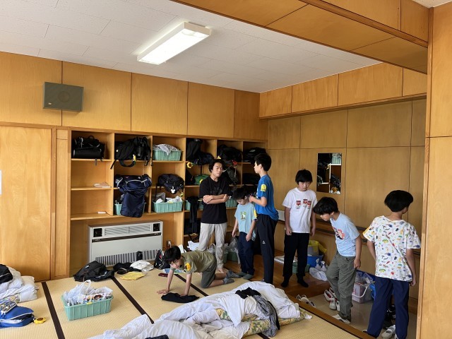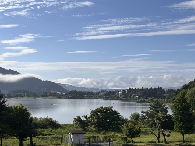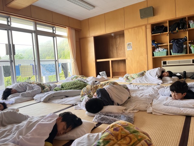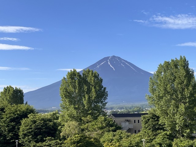 2日目が始まりました。みんな朝までぐっすり寝られたようです。着替えてこれから朝会です。すっきりと晴れて、部屋から富士山や河口湖がきれいに見えます。