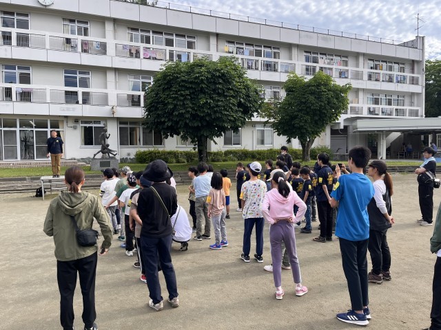 朝会をしました。お天気はよさそうなので、ハイキングに行けますとお話がありました。ラジオ体操で体をほぐしました。「お腹が空いた〜」と声が聞こえてきます。