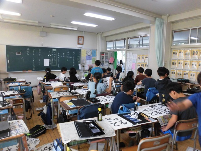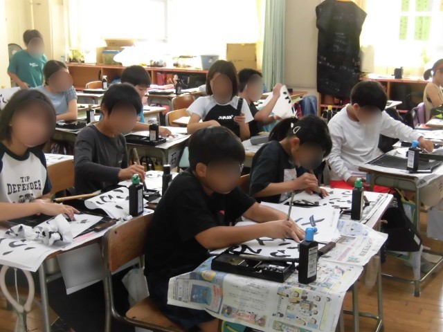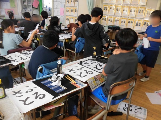 5年生の書写では「ふるさと」を毛筆で練習しました。ひらがな4文字の点画のつながりや字の形に気を付けて書きました。お手本をじっくりよく見て丁寧に筆を動かして書き進めていました。4文字のバランスが難しく、苦戦している様子もみられましたが、納得いくまで何度も練習しました。