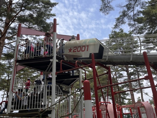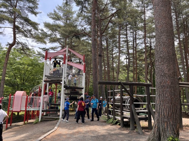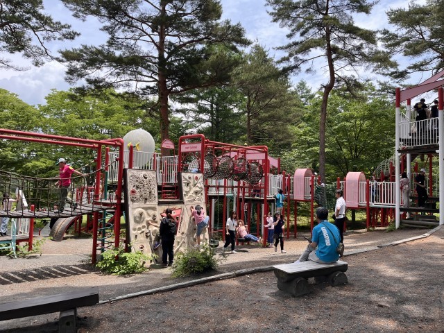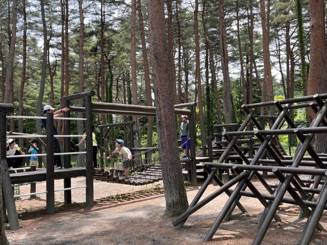 恩賜林庭園に到着しました。はじめは遊具で遊びました。タイヤのブランコや長い滑り台が人気です。友達と声をかけ合いながら楽しそうです。