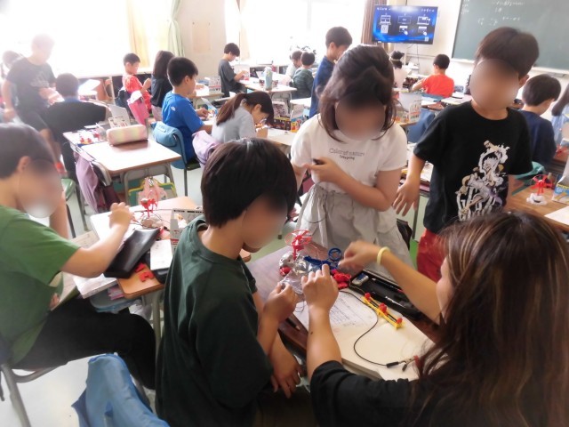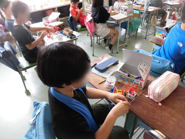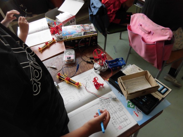 4年生の理科では「電池のはたらき」の学習をしています。2個の電池をつないで直列回路、並列回路について学びます。実験キットを組み立てて、乾電池を使ってモーターを回したり、乾電池の並べ方を変えた場合の変化について実験しました。つなげ方を変えることで、豆電球の明るさがかわることも理解することができました。