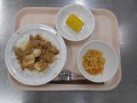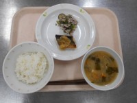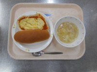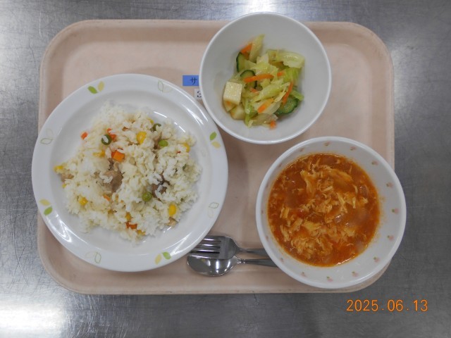 【献立】 牛乳 三食ピラフ ポテト入りフレンチサラダ トマトとたまごのスープ