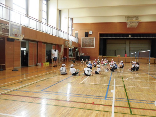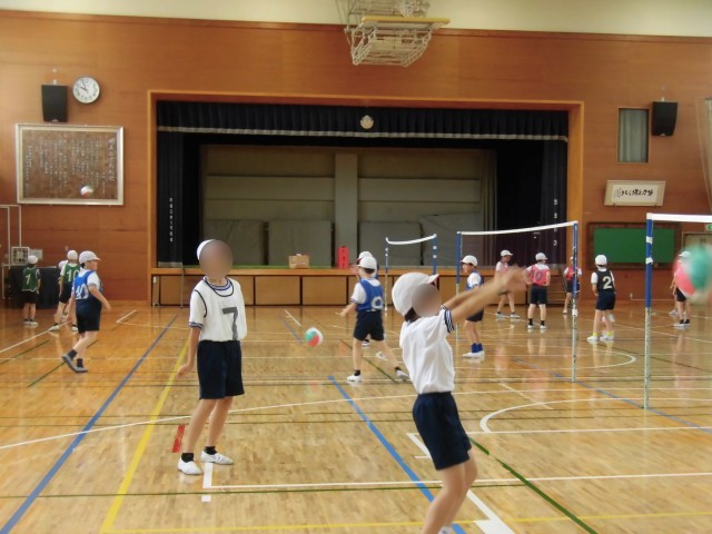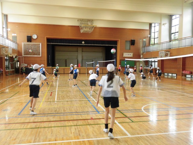5年生の体育では「キャッチアタックバレーボール」に取り組んでいます。今日はグループに分かれてパスの練習をしました。途中で、全員で集まり、ボールを落とさずにパスをつなげるためにはどこをねらうとよいのか、どんなボールがよいのか、どんな工夫が必要なのか考えました。優しく山なりに、相手の胸あたりに、相手に声をかけながら…などたくさんのコツを考えることができました。コツをしっかりと考えながら練習することで、どんどんパスがつながっている様子がみられました。