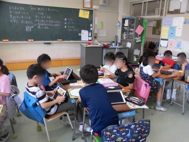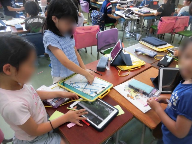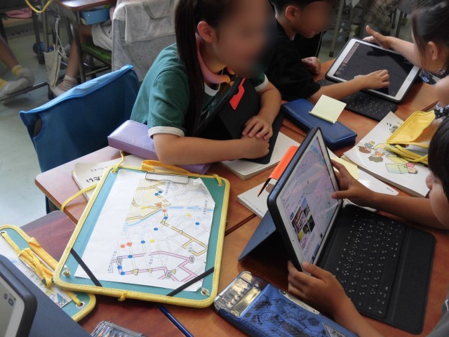 2年生が先日実施したまちたんけんの振り返りをしました。地図を見ながら、まちたんけんでみつけた「町の安全」の場所に、危険だと思ったところ、安全だと思ったところ、そのほか気づいたところに色違いのシールを貼りました。そして、気づいたことやみんなに教えたいこと、説明したいことを文章で付箋に書きました。まちたんけんのことを思い出しながら、グループで話し合うことができました。