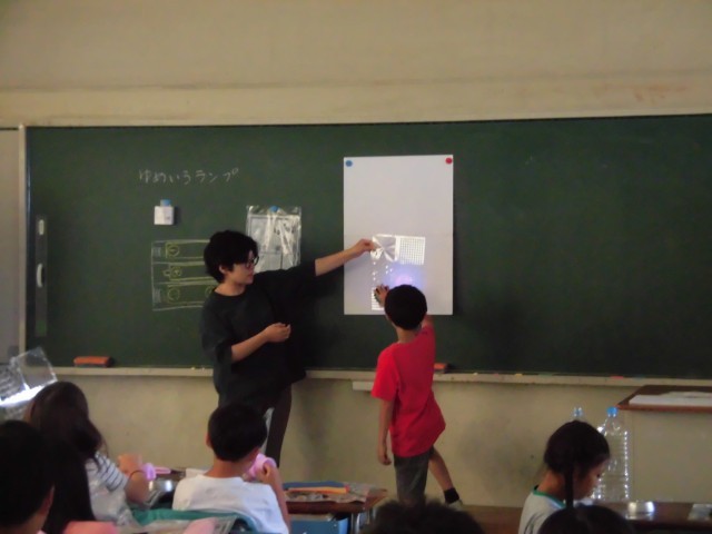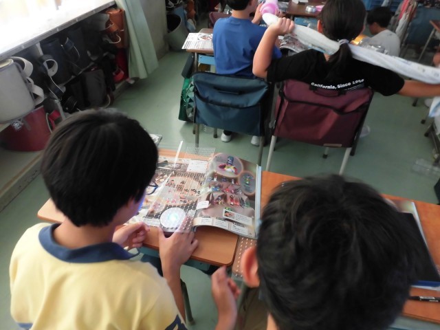 4年生の図工で「ゆめいろランプ」の制作がはじまりました。でこぼこの透明シート、色とりどりのセロハン、金銀のホログラムシート、ネット、ペットボトルなどたくさんの材料を使って、自分だけのランプを作ります。今日は、さまざまな材料にLEDライトを当てるとどのような光を放つのか実験し、どのようなランプをつくるか考えました。ライトを当てる材料をかえることで、光の様子が変化していくことがわかり、お気に入りの光をみつけることができたようです。次回から、ペットボトルに装飾をして、本格的にランプづくりを行います。