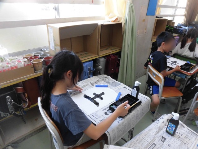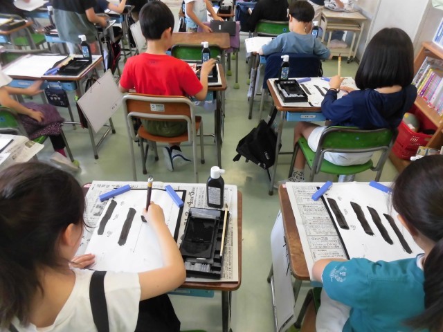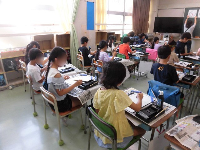 3年生から始まった書写の学習です。今日は縦画の書き方を練習して、「土」の漢字を毛筆で書きました。お手本をよく見て、筆づかいの基本である始筆・送筆・終筆に気を付けながら練習しました。姿勢、筆の持ち方なども注意しながら練習しました。小筆で学年と名前も書きました。少しずつ、書写の準備や後片付けも手際よくできるようになっています。