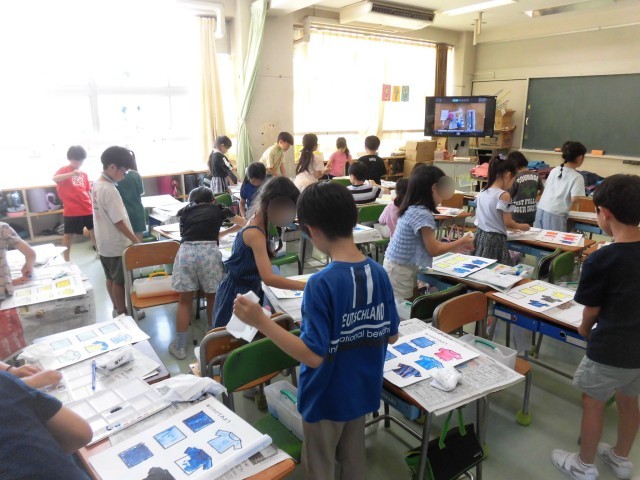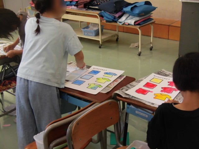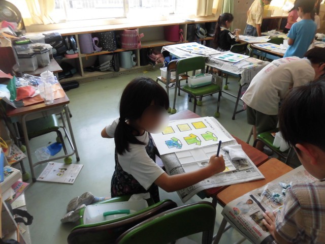 2年生の図工では、絵の具を使った学習が始まりました。まず、新しい絵の具セットを準備し、絵の具道具のそれぞれの名前やの使い方や特性を学習して、準備の仕方、片づけ方、筆の使い方、道具の置き方を学習しました。そして、画用紙に書いてある四角やTシャツの形を好きな色で塗りました。いろいろな色でカラフルに塗ったり、色を混ぜて塗る様子もみられました。初めての絵の具を楽しむことができました。