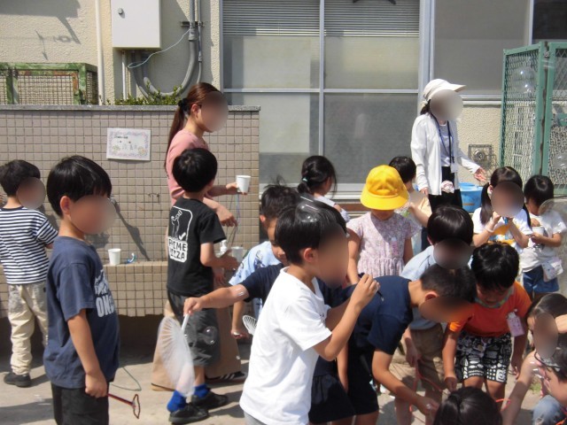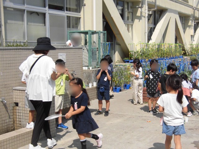 1年生の生活科の「夏と友だち」の学習で、シャボン玉をとばして遊びました。大きなたらいにたくさんのシャボン玉液を作って、ストローだけではなく、ハンガー、うちわなどの身近な道具を使い、しゃぼん玉作りに挑戦しました。大きなシャボン玉ができて、大喜びしたり、フワフワ飛んでいくシャボン玉を追いかける様子が見られました。しゃぼん玉をたくさん上手に作るために、友だちとアイディアを出し合って、工夫しながら遊ぶことができました。きれいな青空に、しゃぼん玉がたくさん飛び、夏を楽しむことができました。