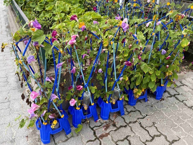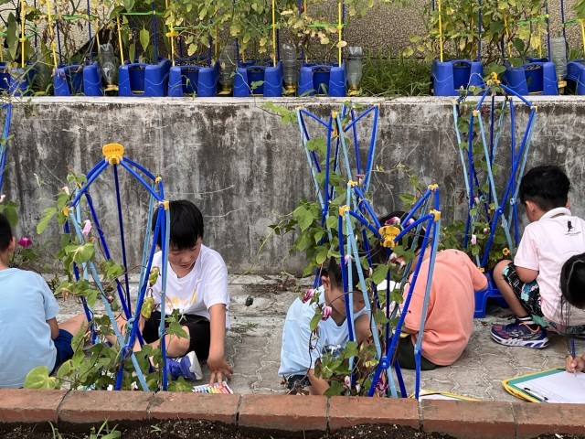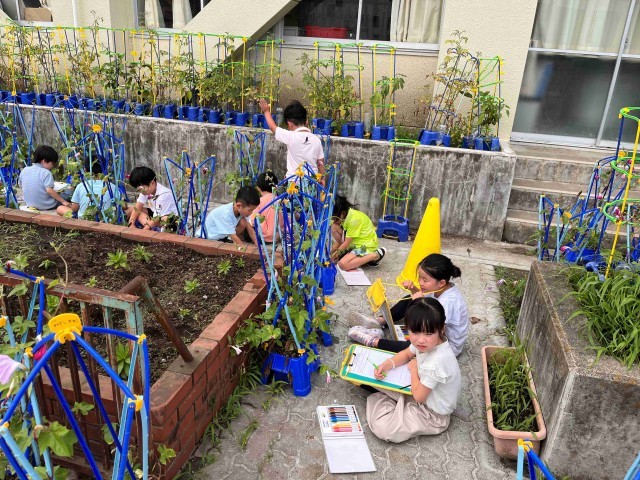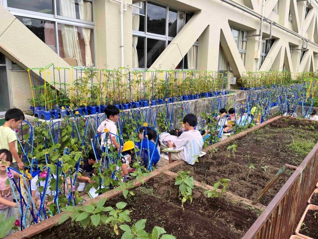 1年生が育てているアサガオがぐんぐん大きく育っています。観察カードに花や葉の様子を記録しています。「花がしおれちゃった」「お昼だからだよ、朝はしっかり咲いてたよ」「明日の朝、見てみよう!」と子ども同士で話していました。