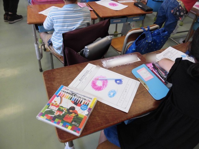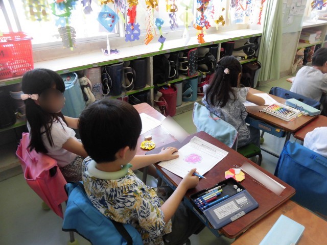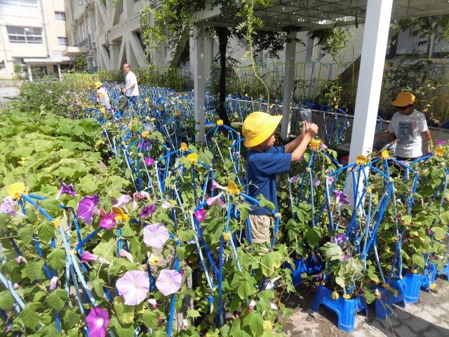 1年生があさがおの観察をしています。毎日かかさず水やりもして、ぐんぐん成長し、立派な色とりどりの花がたくさん咲いています。今日は、花の観察をして、観察カードに記録しました。花の様子をしっかりと見て、手触りも確認しました。「お花が大きいね~」「いろんな色があるね~」「きれいだね~」ととても嬉しそうにあさがおの観察をする様子が見られました。