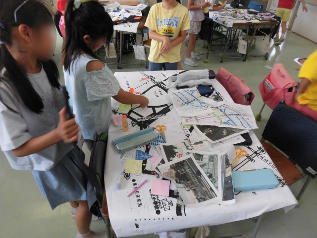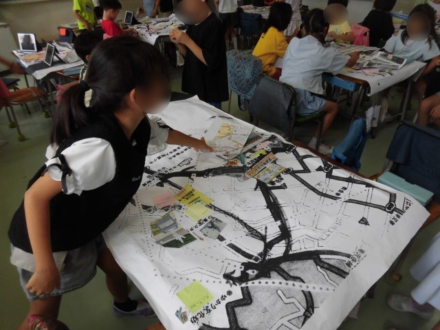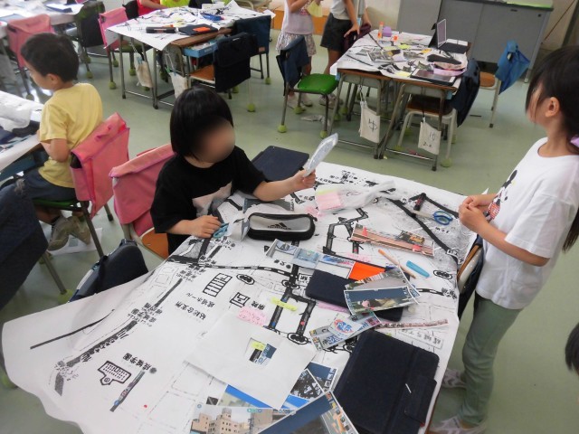 2年生が、まちたんけんでみつけた「町の安全」を大きな地図にしました。グループに分かれて、危険だと思ったところ、安全だと思ったところ、そのほか気づいたところにしるしをして、町たんけんの時に撮った写真をプリントアウトして貼りました。また、気づいたことや伝えたいことを書いた付箋を貼るなど、分かりやすく見やすい地図を作り上げました。グループで協力して、より良い地図になるように話し合い、意見を出し合いながら進める様子が見られました。地図にすることで、自分たちが住む町の安全により興味を持つことができたようです。