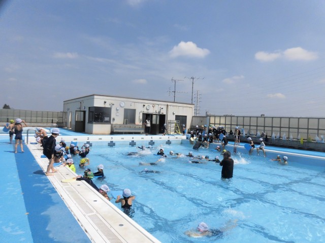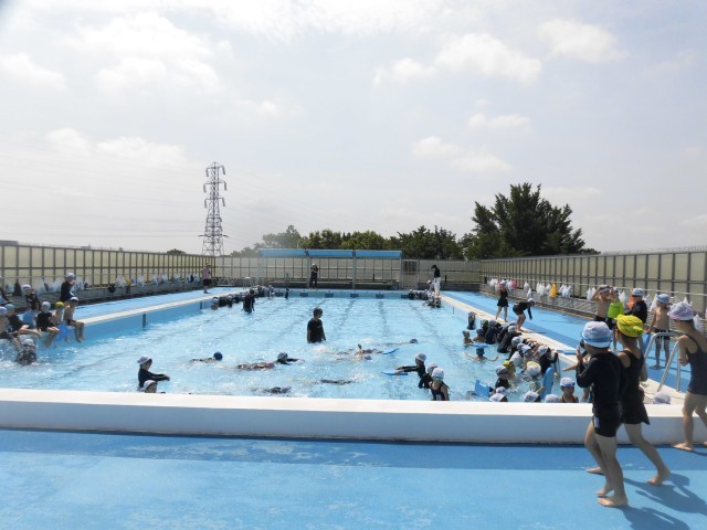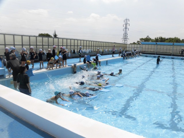 1年生のプール学習も最終日を迎えました。プールの決まりを守り、バディでの人数確認も、スムーズにできるようになりました。水中で歩いたり、浮いたり、顔をつけたりする水遊びの活動を通して、水に親しむことができました。ビート板を持ってバタ足に挑戦する様子もみられ、水中での基本的な動きもしっかりと身につけることができました。今日はたいへん暑い日となりましたが、気持ちよくプール学習を行いました。初めての学校のプールも楽しく活動できたようです。