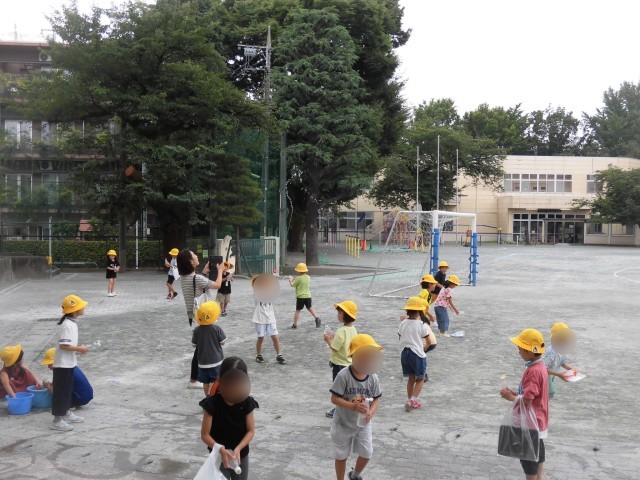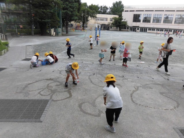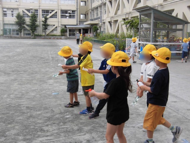 1年生の生活科で学習している「なつとともだち」で、今日は水てっぽうで遊びました。家庭から持ち寄ったマヨネーズやケチャップ、洗剤の空き容器をを使って、水遊びをしました。遠くまで水を飛ばしたり、高く高く水を飛ばしたり、水で地面に絵を描いたりしました。「こんなに遠くまで水が飛んだー!」「ハートがかけた!」「お花がかけた!」と大喜びする様子が見られました。水をかけ合いっこして遊ぶなど、楽しく活動できました。