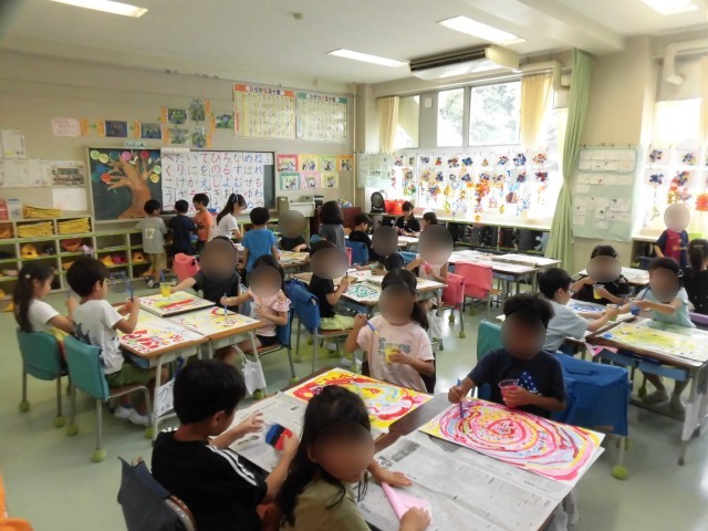1年生の図工で「すいすいぐるーり」の作品を制作しています。絵の具をつかって、線のかき方や色の使い方を工夫して、大きな画用紙に自由にのびのびと描きました。絵筆をすいすい動かしたり、ぐる~りとまわしてみたり、ちょんちょんと点を描いてみたり、色を変えながら思うままに筆を動かしました。画用紙いっぱいにカラフルな模様が浮かび上がり、楽しく活動できました。