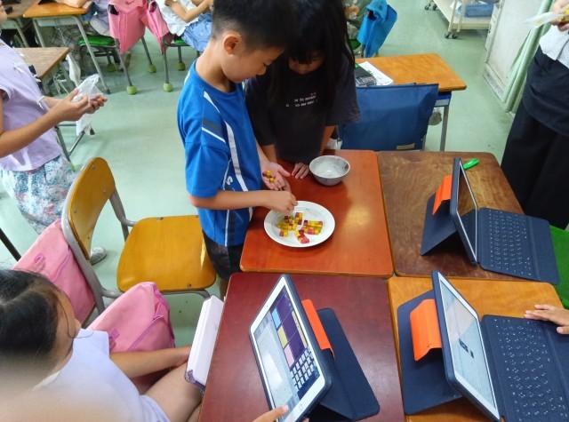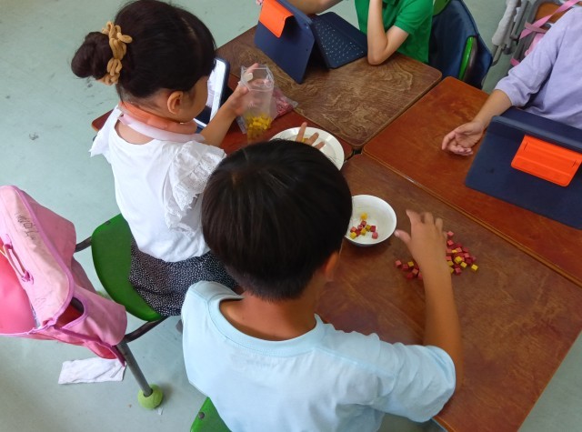 2年生は算数で3けたの数(3位数)について学習しています。数が大きくなると表し方や位取りが難しいようです。実際にブロックを使って、数の感覚を感じられるようにしています。