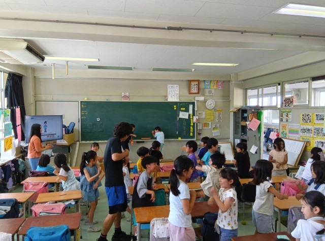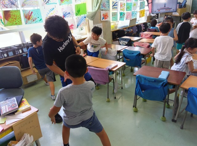2年生が英語活動を行っています。ALTと英語の歌を歌って楽しそうです。歌の途中でジャンケンをするところは特に盛り上がっていました。