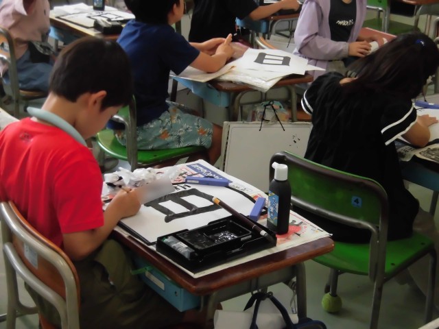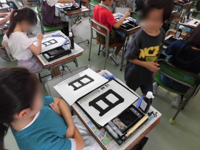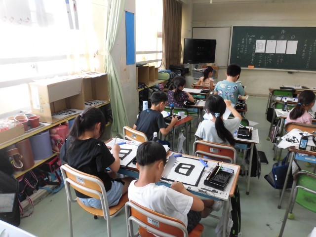 3年生の書写では「日」の文字を毛筆で書きました。今日は、「折れ」の筆づかいをしっかりと練習しました。かすれないように筆に墨汁をしっかりとつけることや、横画を少し右上がりにすることなどにも気をつけて丁寧に書きました。バランスよく書くのに苦戦しましたが、納得する作品もできあがり、どの作品を提出するか迷う様子も見られました。毛筆の学習にも慣れてきて、準備や片付けもしっかりとできるようになりました。
