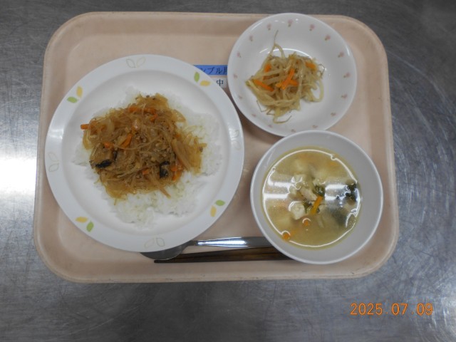 【献立】 牛乳 マーボー春雨丼 豆腐スープ もやしの中華サラダ