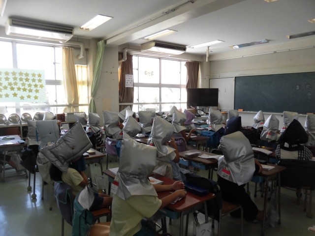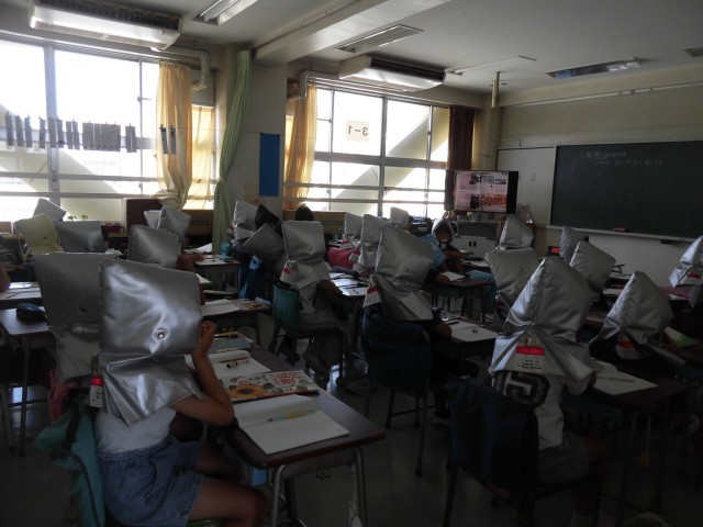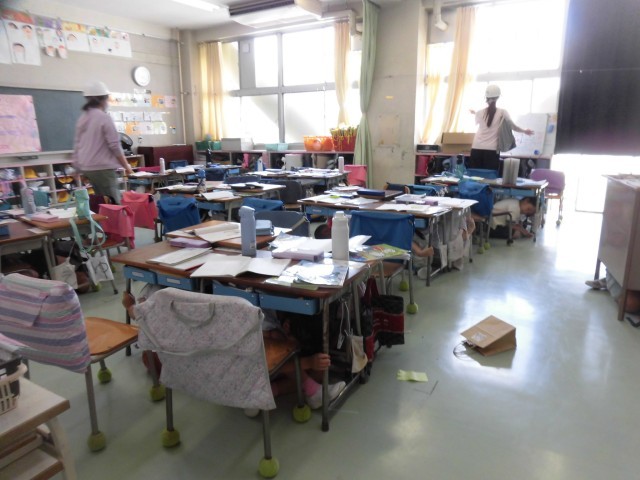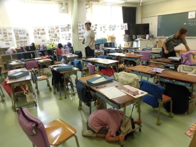 今日は1学期最後の避難訓練を行いました。大きな地震が発生し、その影響でポンプ室から出火した想定で行いました。非常放送がなるとすぐに防災頭巾をかぶり、机の下に身を隠しました。今日は、揺れがおさまったところで、各教室で副校長先生からのお話をしっかりと聞きました。避難する際は、「お・か・し・も(おさない、かけない、しゃべらない、もどらない)」の約束をまもること、火事のときはハンカチなどで口を押さえ避難すること、放送をしっかりと聞くこと、火事が起こった場合は校内のどこから出火したのかひとりひとりが確認して避難をすることなど、自分の身を守るために大切なことを改めて確認しながら話を聞きました。