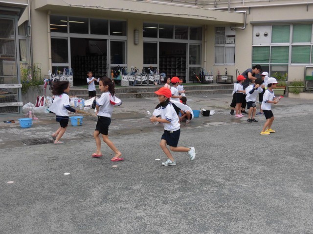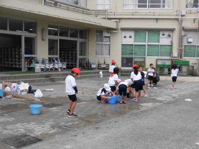 校庭から、にぎやかな声が聞こえてきました。1年生が水遊びをしていました。ペットボトルやケチャップ、マヨネーズの容器、ビニール袋など使う道具はさまざまです。ビニール袋にいくつか穴をあけてじょうろのようにしたり、ケチャップの空容器いっぱいに水を入れて水鉄砲にしたり、思い思いの方法で楽しく遊んでいました。水鉄砲では、いちばん遠くまで飛ばす競争や、友だちの背中につけた紙を狙うおにごっこがとても盛り上がっていました。気温が下がり動きやすい気候の中、どの児童も元気いっぱいに走り回っていました。