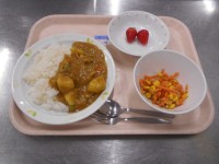 【献立】 牛乳 カレーライス にんじんサラダ くだもの(いちご)【主な食材と産地】 にんにく 青森県 たまねぎ 北海道 セロリー 福岡県 にんじん 徳島県 じゃがいも 北海道 りんご 青森県 しょうが...