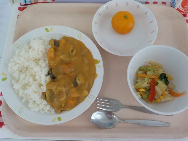 1学期最後の給食は、夏の三宿カレーライス・カラフルサラダ・冷凍みかん・牛乳です。