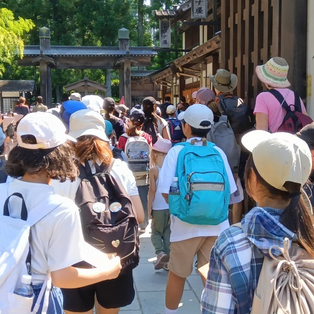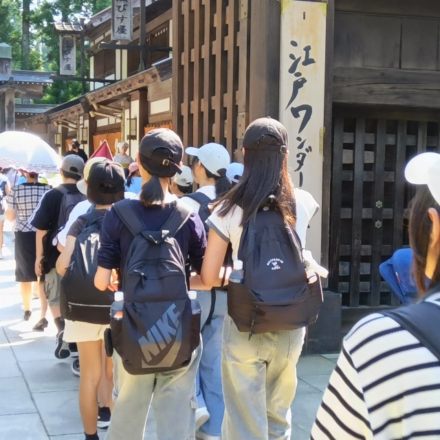 江戸村に入りました。行動班ごとに見学、体験を行います。
