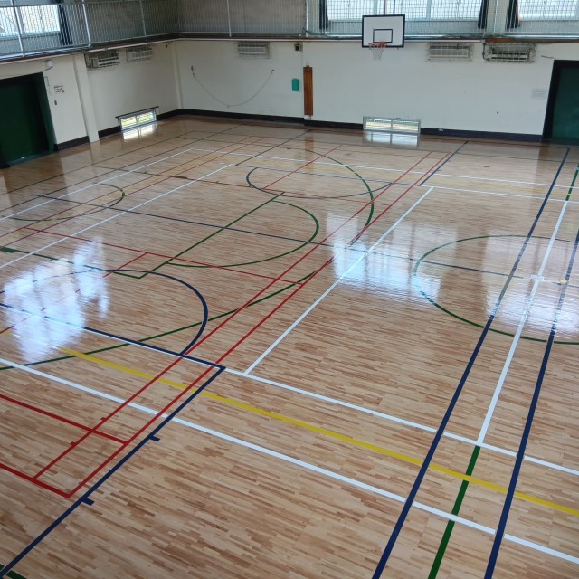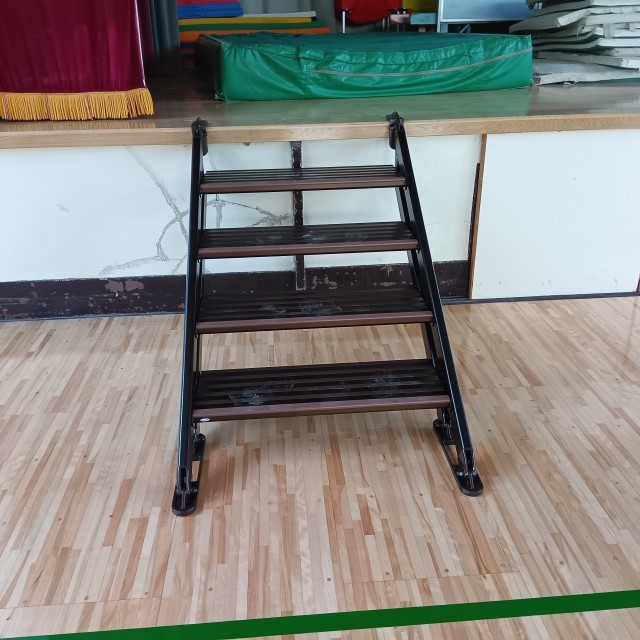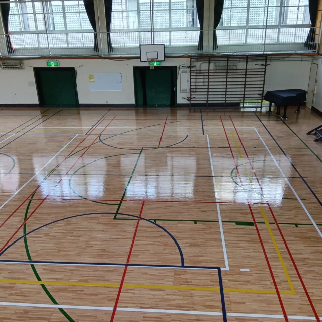 8月の初旬から行われていた体育館の床工事終わりました。きれいに磨かれ、競技用のラインもしっかり引かれています。舞台への階段も新しくなりました。