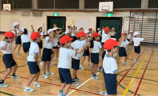 体つくり運動に取り組んでいます。学期はじめにぴったりの「体ほぐしの運動」。