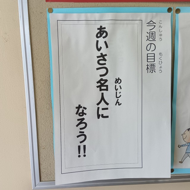 今週の生活目標は「あいさつ名人になろう」です。挨拶の仕方のポイントを週番の教員から伝えました。