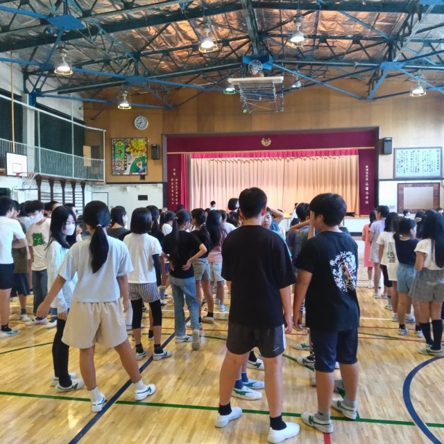 今朝は全校朝会を行いました。少しずつ気温が下がり体育館のエアコンも効き始めました。