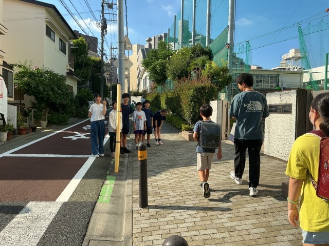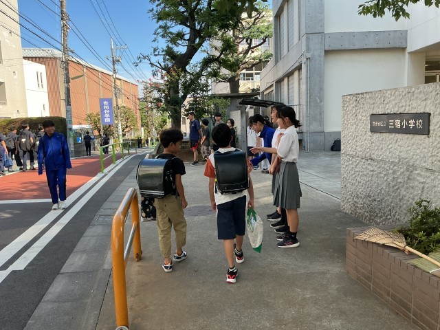 学び舎あいさつ週間が始まりました。三宿中学校の生徒と本校6年生が、門の前であいさつをしてくれます。(12日)