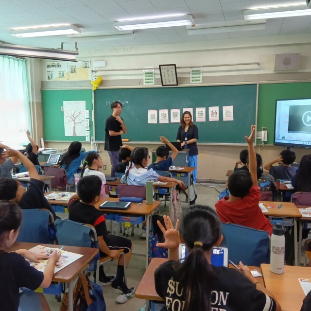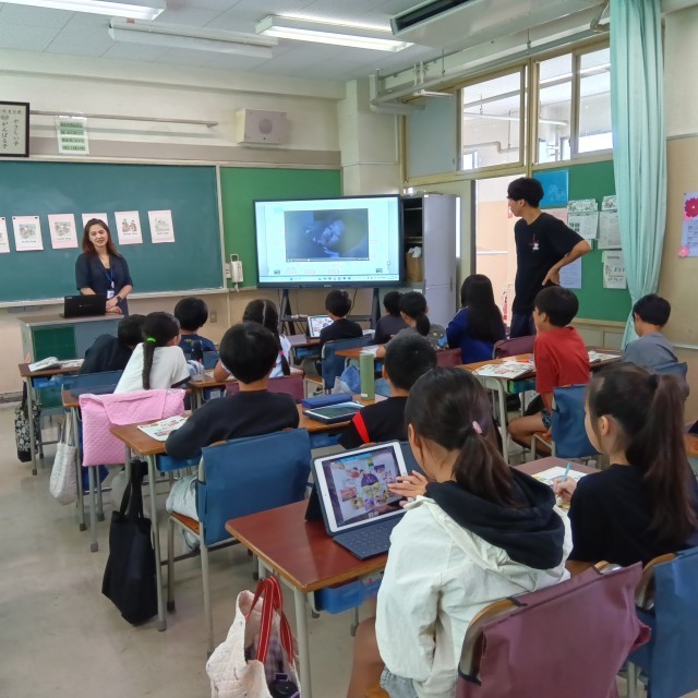 4年生の外国語活動です。ALTのネイティブな英語で発音を学びます。担任と二人で指導をしています。