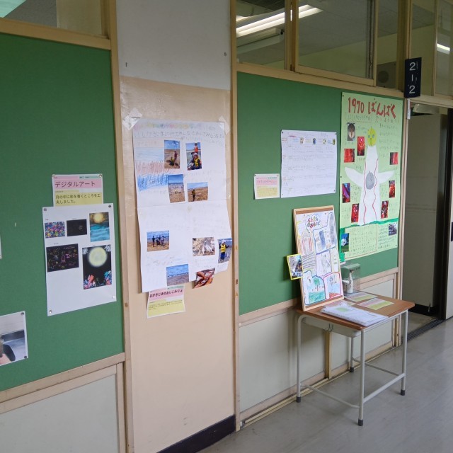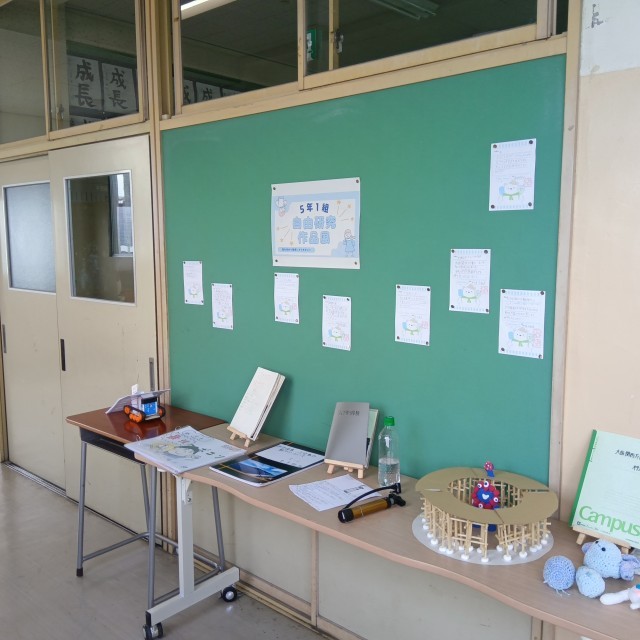 宿題ではありませんでしたが、長い休み期間を利用して調べ学習、調査したまとめ、工作作品などを作ったお子さんたちがいました。作品を各学級の廊下や教室内に展示しています。