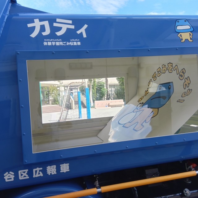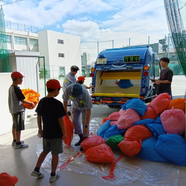 世田谷区清掃課の方にきていただき、ごみ収集車の見学と体験学習をしました。