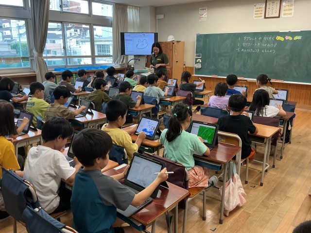 5時間目、タブレットの学習を行いました。メモ機能を使い、絵を描いたり文字を書いたりしました。