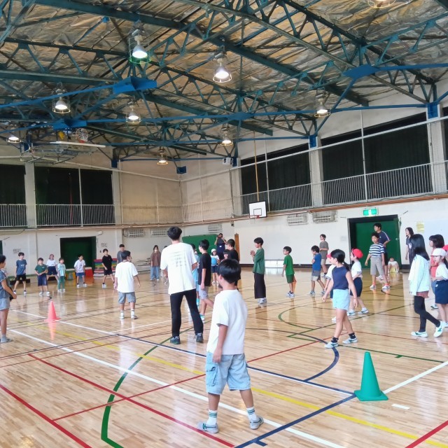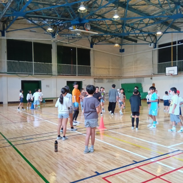 にじいろ班同士の交流わ目的に、中休みにドッジボールで遊びました。オレンジ班対赤班のゲームです。