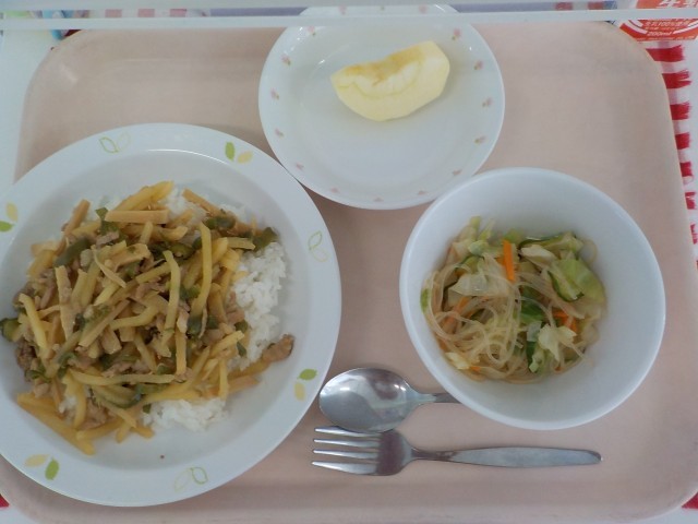 本日の給食は、チンジャオロース丼・春雨サラダ・りんご・牛乳です。