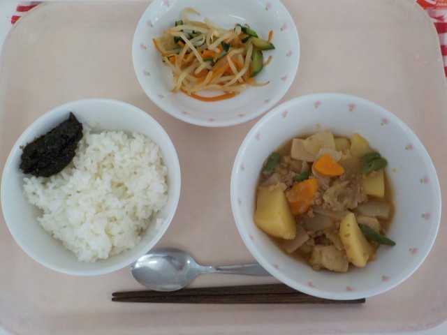 本日の給食は、ごはん・のりの佃煮・じゃがいものそぼろ煮・野菜の和え物・牛乳です。