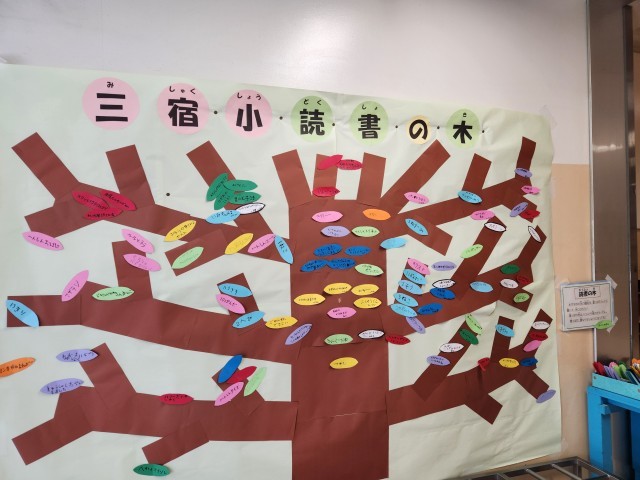 「読書の木」を児童昇降口に掲示しています。おすすめの本の題名を葉っぱの形のカードに書いて貼っています。カードの色は、にじいろ班の色です。