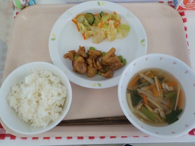 本日の給食は、ごはん・チキンチキンごぼう・即席漬け・沢煮椀・牛乳です。