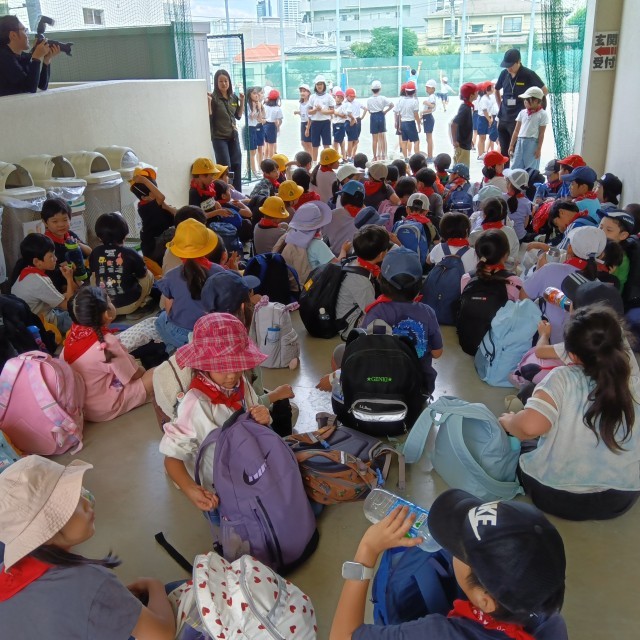 汗びっしょりになりました。たくさん歩いて元気にかえってきました。校庭の3年生が、「おかえり」と、挨拶をしてくれました。「ただいま」で返しました。