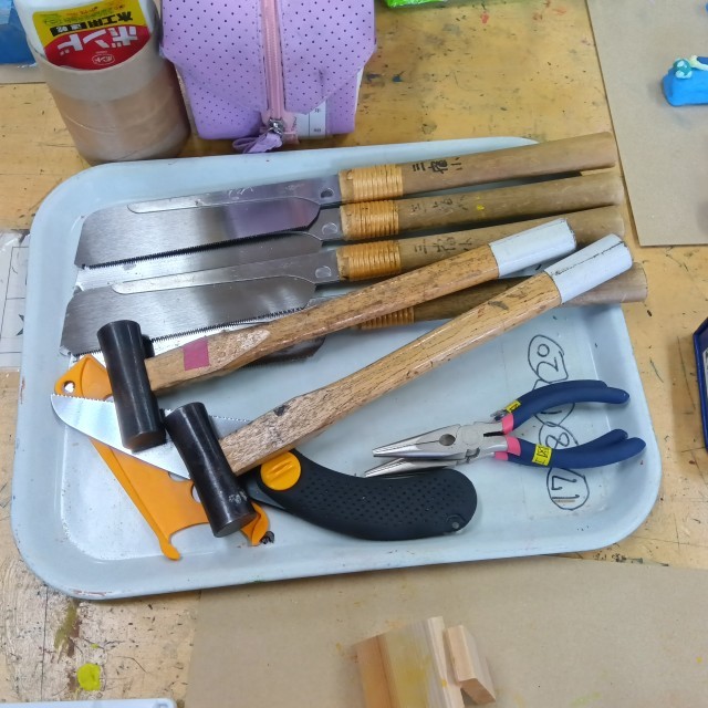 のこぎり、金槌、ペンチの道具を安全に使うことも学んでいます。